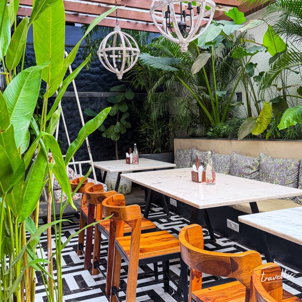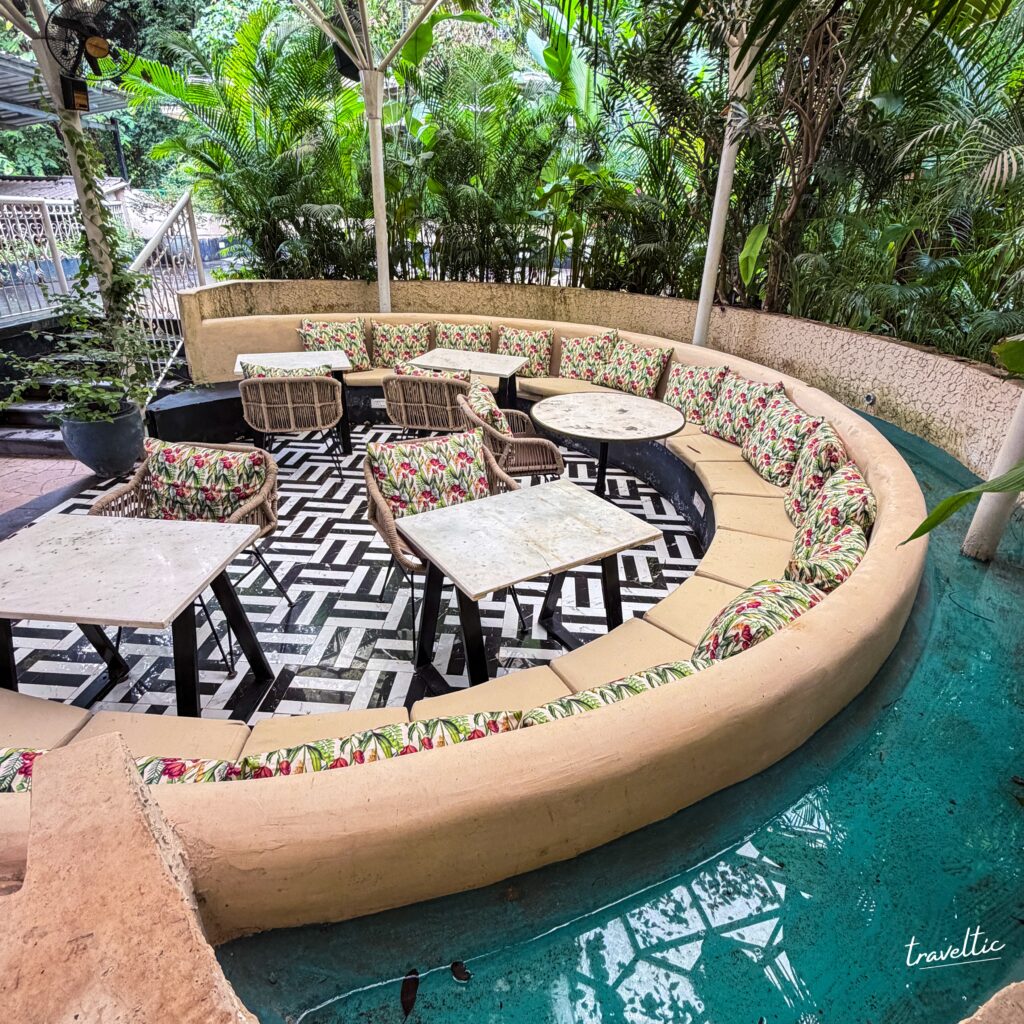 But where Jugnu truly shines is its outdoor seating. Picture this: lush tropical gardens with towering palm trees creating a natural canopy, white rope-weave chairs adorned with floral cushions, and perfectly placed accent lighting. There’s even a breathtaking waterfall garden feature that transforms the outdoor space into something almost magical. Dining here feels like a private garden party at a sophisticated friend’s estate. The Assagao fine dining experience extends beyond food—it’s about the total sensory journey.